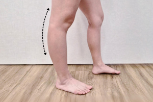 雙手垂直自然往下,約到小腿脛骨位置,感受到臀部與腿後緊繃即可。